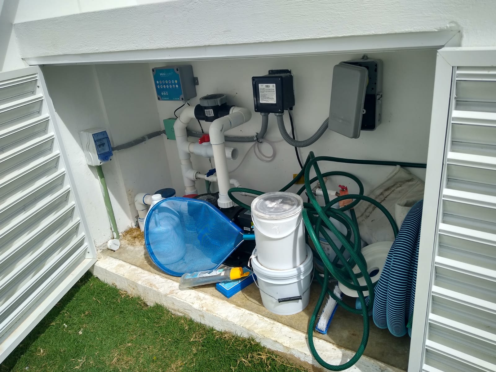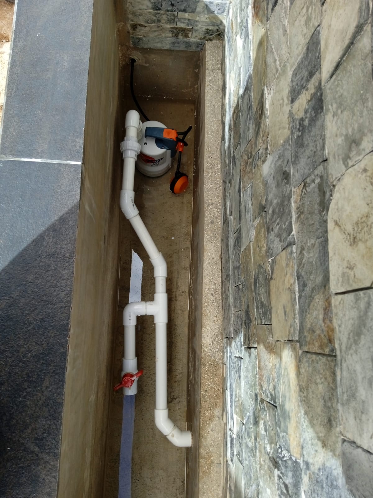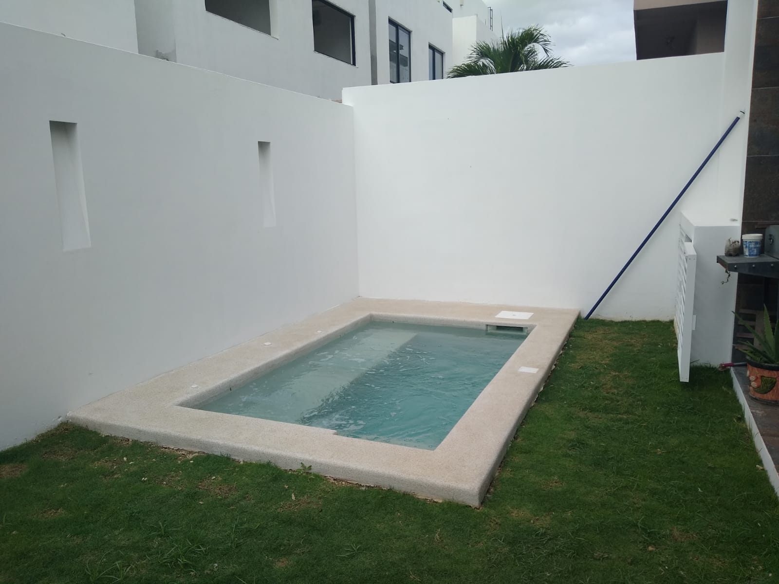 Construcción de alberca ecológica con sistema de filtrado MAXFIL, sistema de hidromasaje e iluminación LED RGB, colocación de acabado PEBBLE coat modelo BLANCO PERLA en interior de alberca y andador.