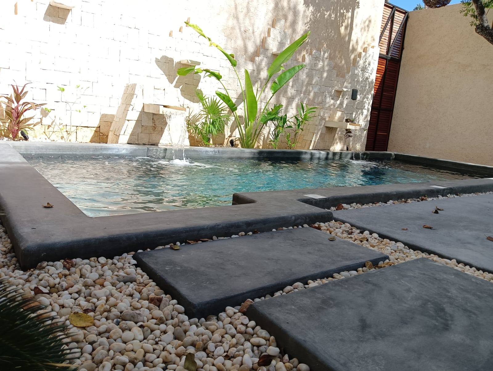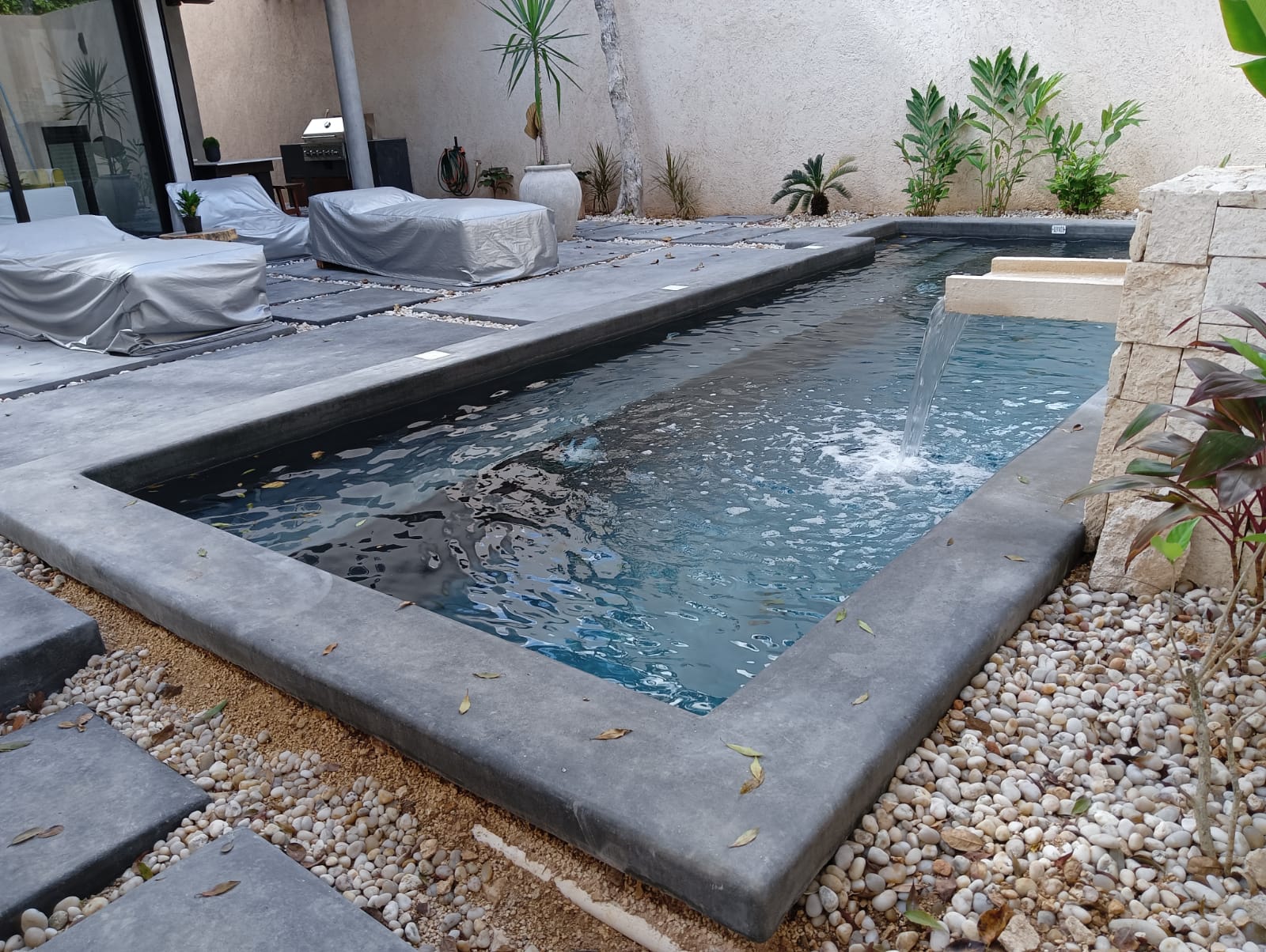 Suministro y colocación de acabado PEBBLE modelo NEGRO INDIGO, impermeabilización y obturación de salidas hidráulicas y eléctricas.