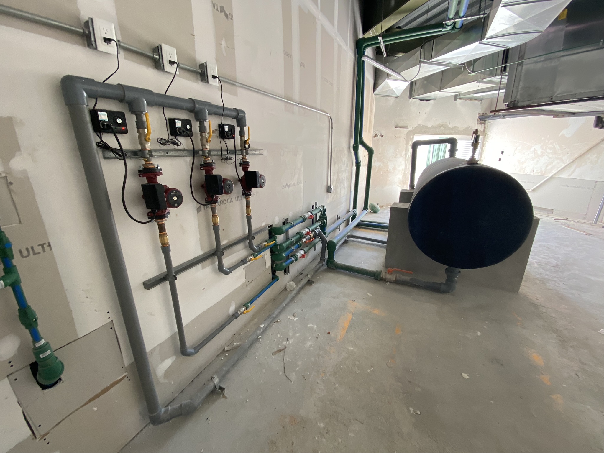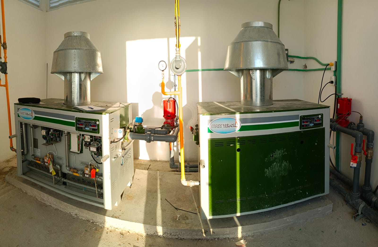 Suministro e instalación de equipos para agua caliente con calentadores MASSTERCAL, tanque de depósito y recirculadoras con control automático.