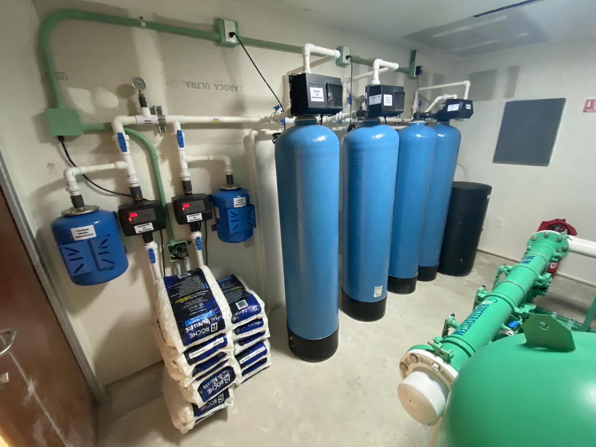 Suministro e instalación de equipos de tratamiento de agua con suavización twin y bombeo trasvase de velocidad variable con dosificación de cloro automático.