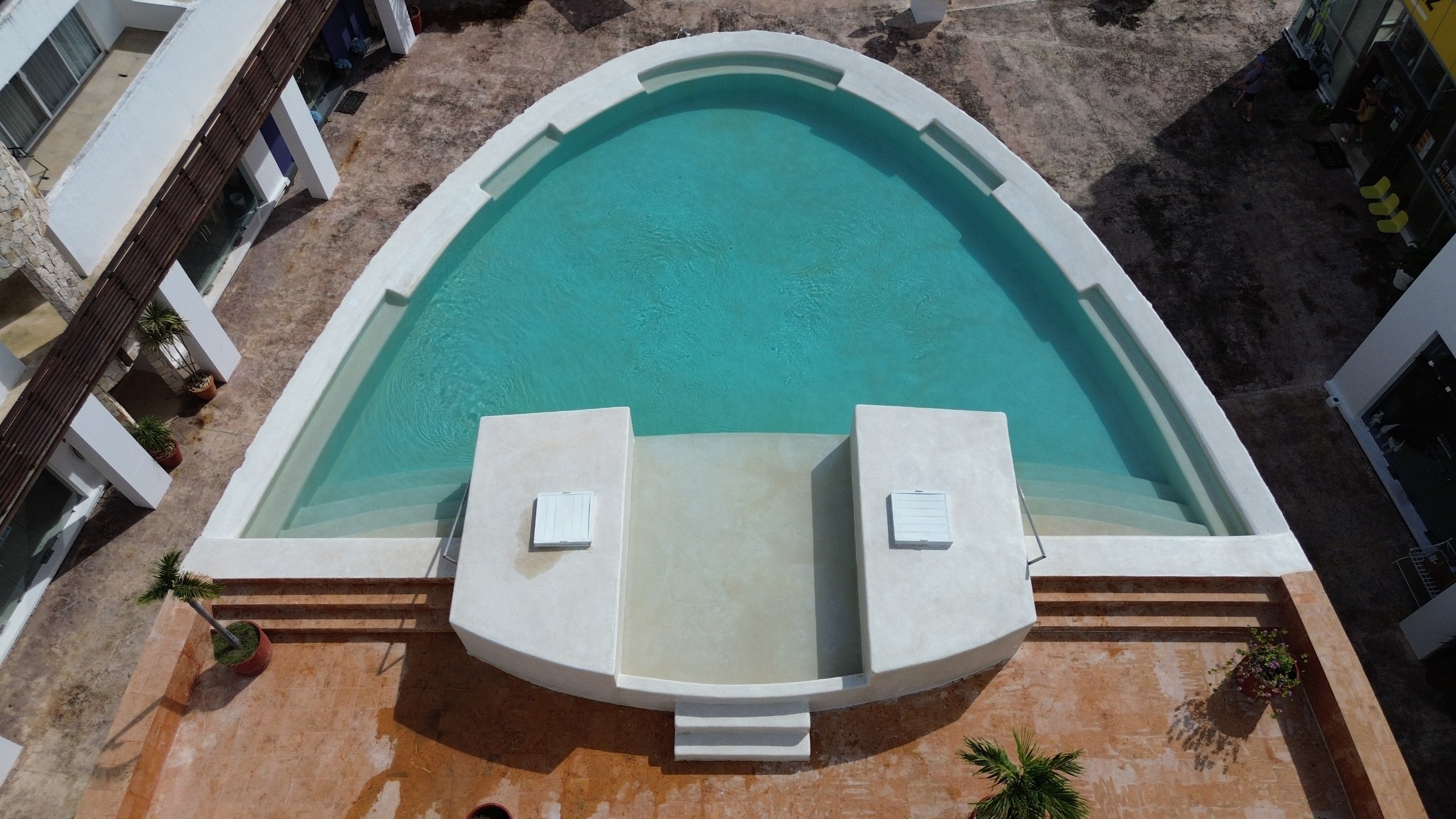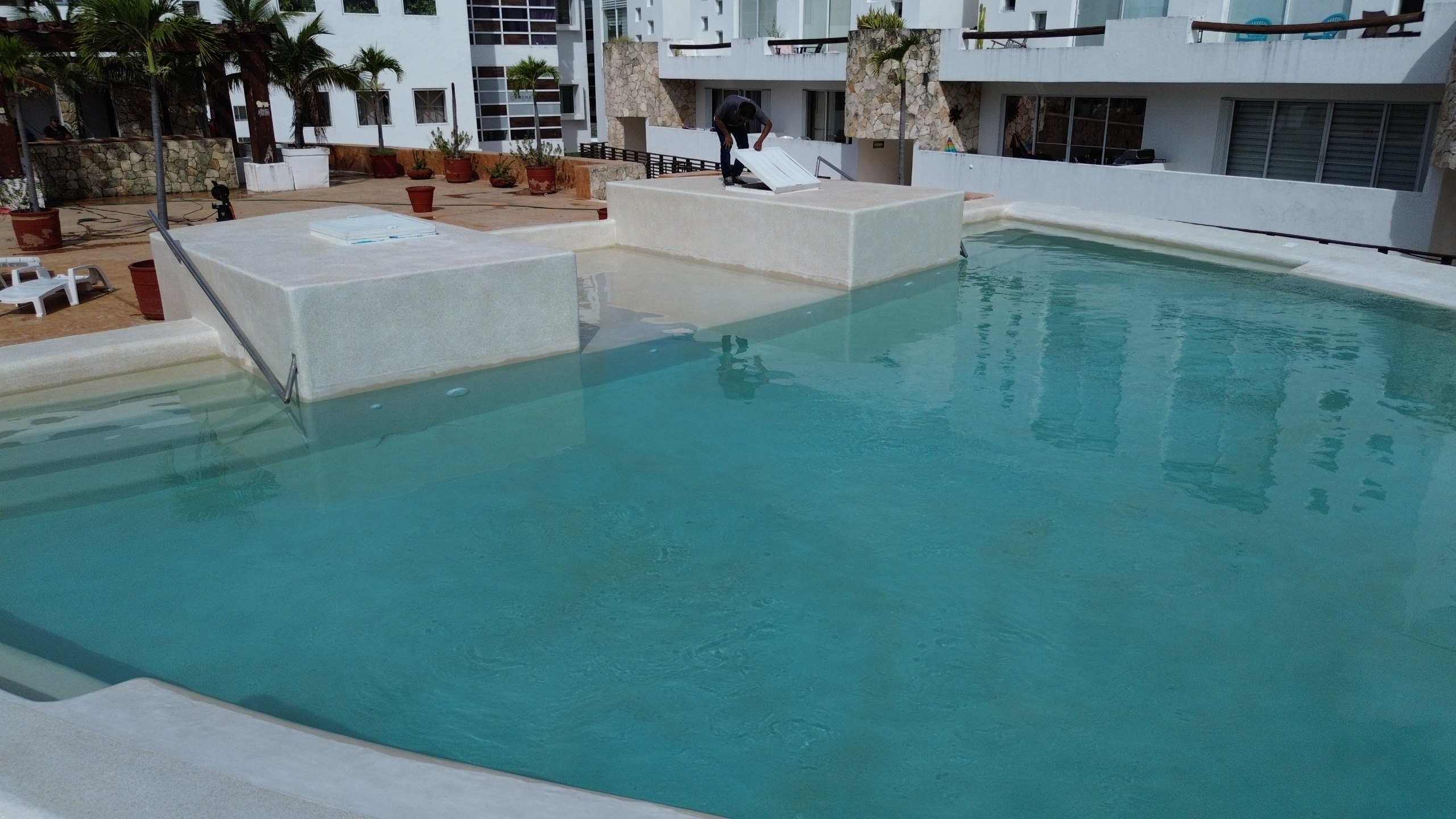Suministro y colocación de acabado PEBBLE COAT FINE en andador perimetral de alberca.