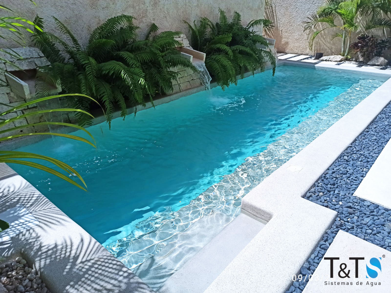 Suministro y colocación de acabado PEBBLE BLANCO PERLA CON CHISPAS NEGRAS en andador perimetral de alberca.