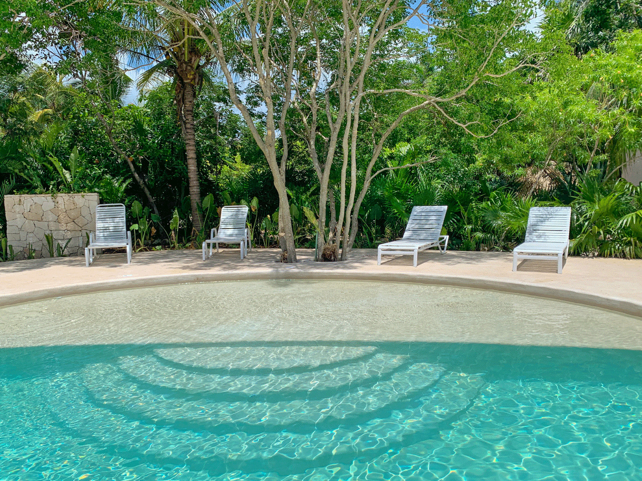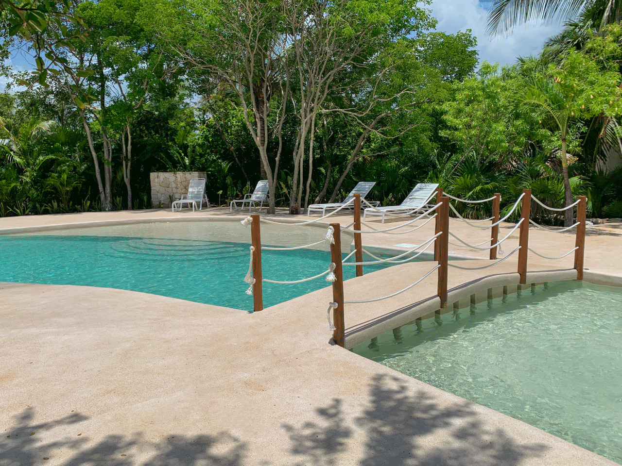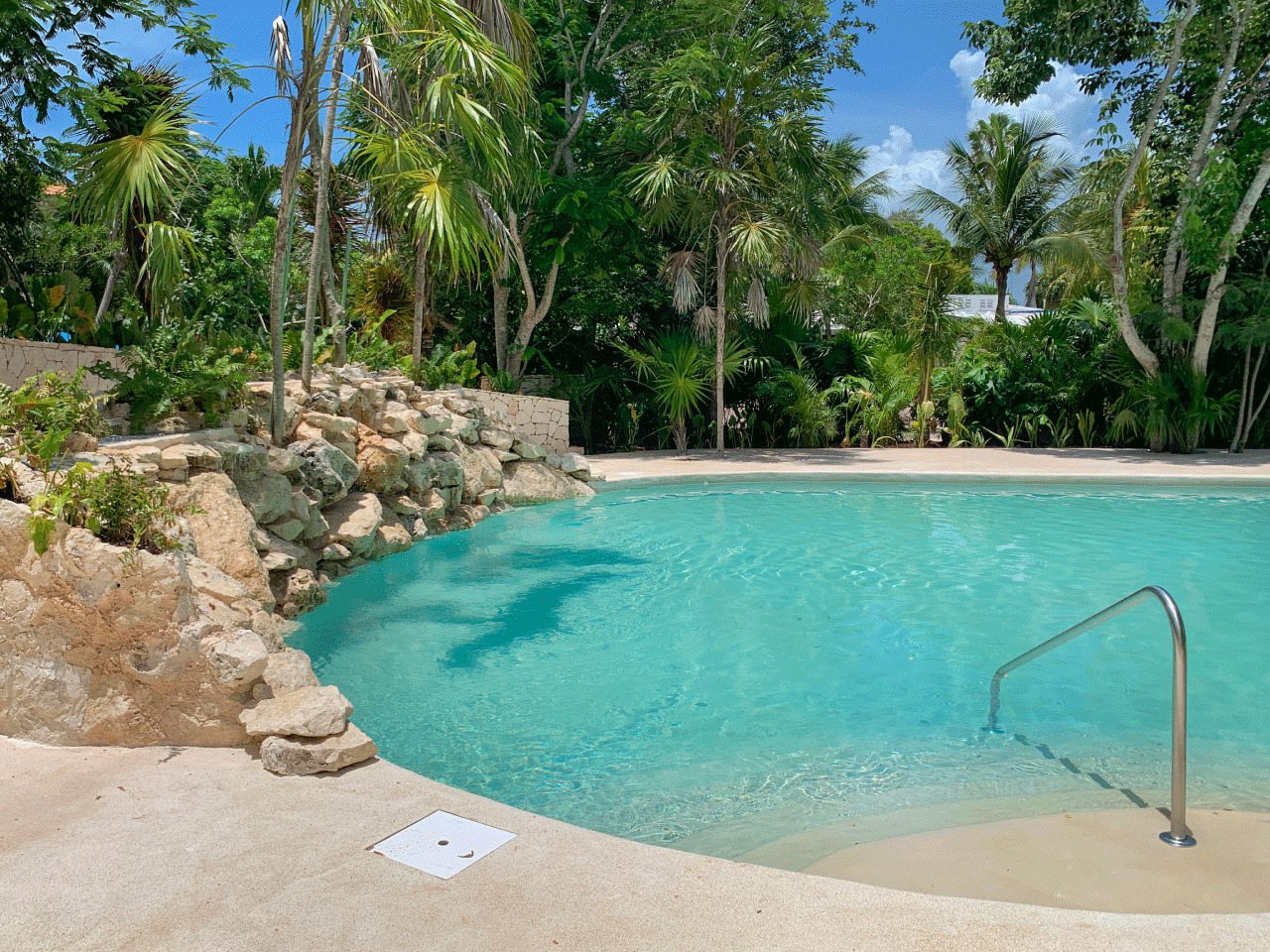 Forjado de cascada natural con piedra de la región y muros y casetas con piedra maya.